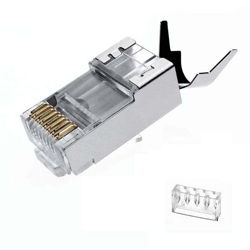 High-speed RJ45 pass-through connector with 50µm gold-plated contacts, suitable for Cat7 and Cat6A 23 AWG Ethernet cables.